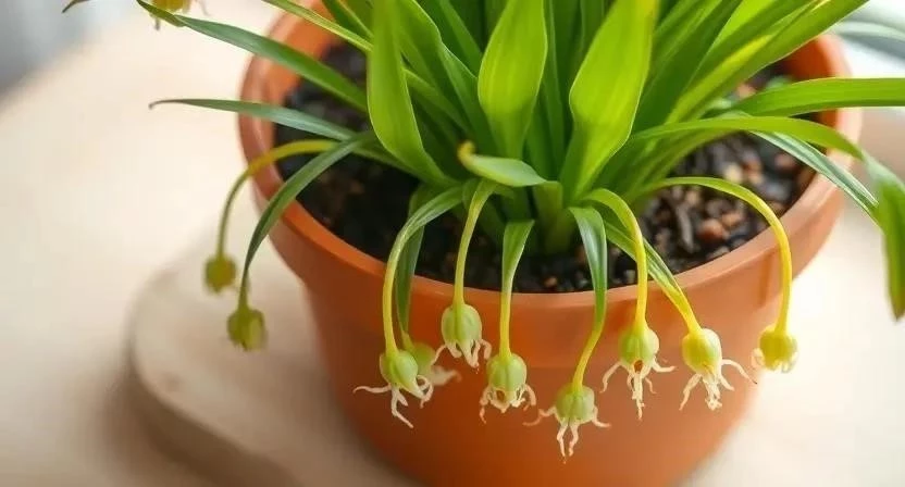Хлорофитум может цвести в домашних условиях, но цветение не является обязательным. Цветки мелкие, белые, собраны в рыхлые соцветия. Для стимуляции цветения обеспечьте растению яркий рассеянный свет, умеренный полив и подкормку. После цветения удалите отцветшие соцветия.