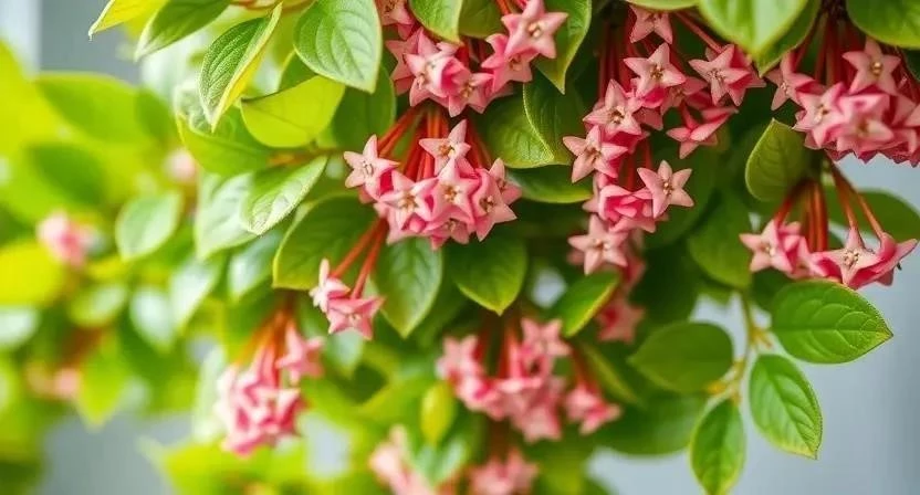 - Hoya carnosa ‘Rubra’: Листья приобретают розовый оттенок при ярком освещении.