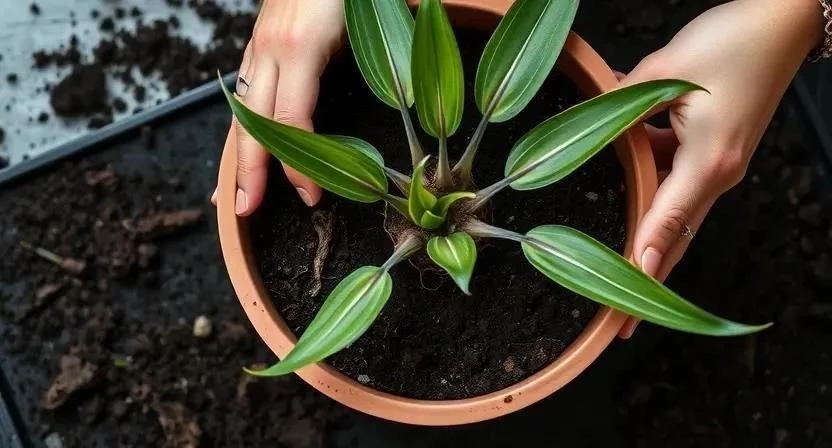 - Поместите растение в горшок и засыпьте его почвенной смесью.