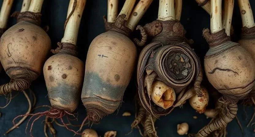 - Белая гниль: Белый мицелий на стеблях и корнях.