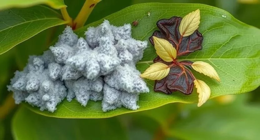 - Мучнистая роса: Белый налет на листьях, похожий на муку.