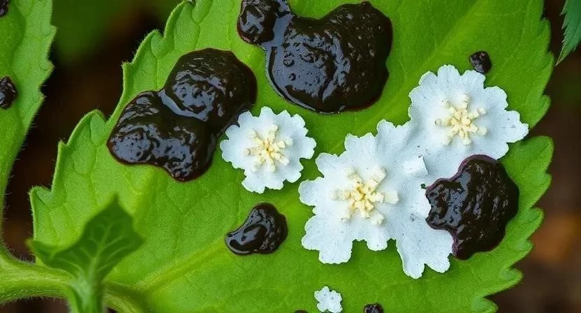 - Налет на листьях и стеблях: Белый, серый или черный налет, состоящий из спор грибка.