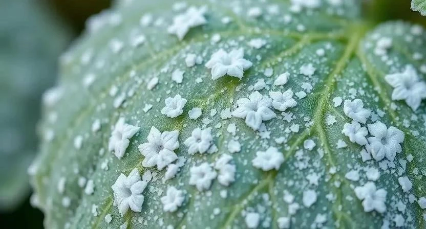 - Мучнистая роса: Белый налет на листьях, стеблях и плодах, похожий на муку.