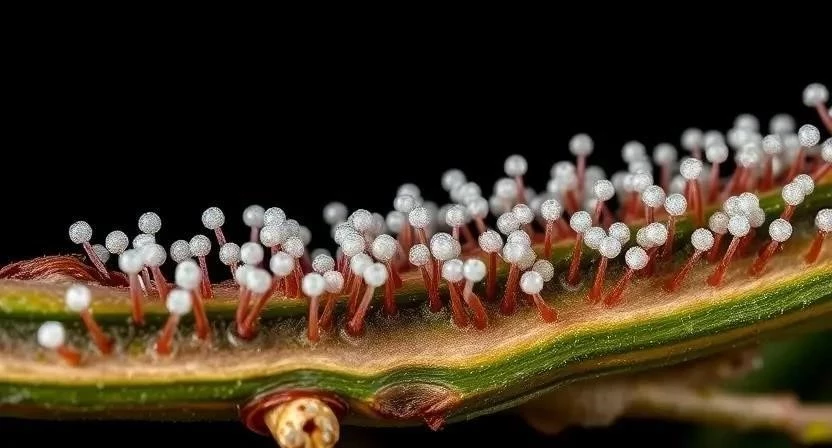 - Появление спор: Мелкие, цветные образования на пораженных участках растения.