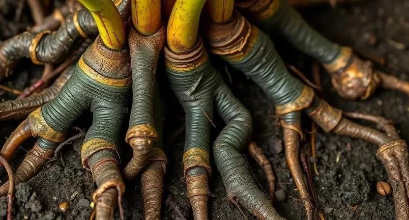 - Состояние корней: Корни могут быть потемневшими, размягченными или покрытыми гнилью.