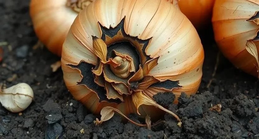 | Гниль донца | Мягкое, водянистое гнилое пятно на донце луковицы |