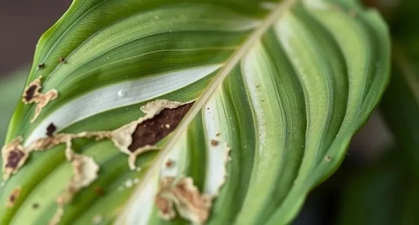 - Серебристый отблеск на листьях: Признак повреждений, нанесенных трипсами.