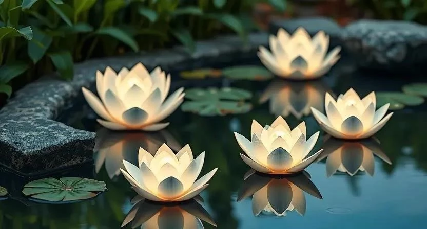 - Виды: Существуют различные виды плавающих светильников, в том числе в форме лотосов, лилий и других водных растений.