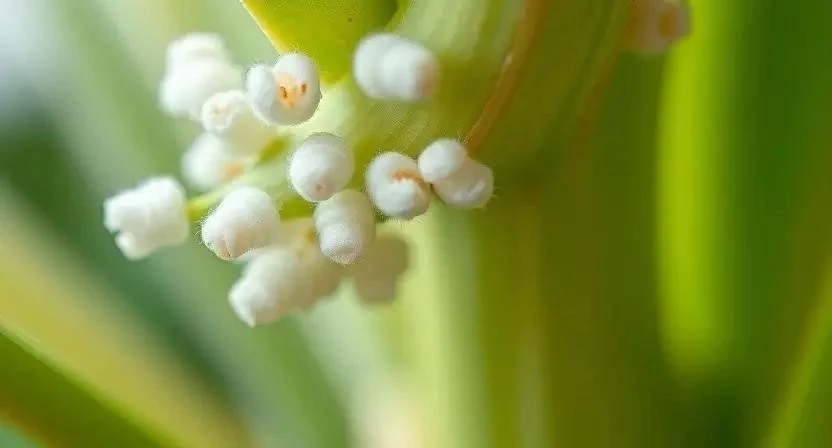Червец – еще один опасный вредитель, который поражает листья, стебли и корни растений. Он выглядит как маленькие ватообразные комочки. Червец также высасывает сок из растения, вызывая его ослабление и гибель.