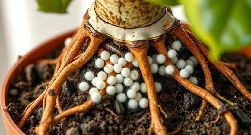 Первые признаки поражения мучнистым червецом – это появление белого ватного налета на листьях, стеблях и плодах. Листья начинают желтеть, скручиваться и опадать. Стебли деформируются, на них могут появляться наросты. При сильном поражении растение замедляет рост, истощается и может погибнуть. Обязательно осмотрите корни, особенно если растение пересаживали или долгое время стояло в одном горшке. На корнях также можно обнаружить белые комочки червеца. Не игнорируйте липкую медвяную росу, которую выделяют червецы – на ней развивается сажистый грибок, который усугубляет состояние растения.