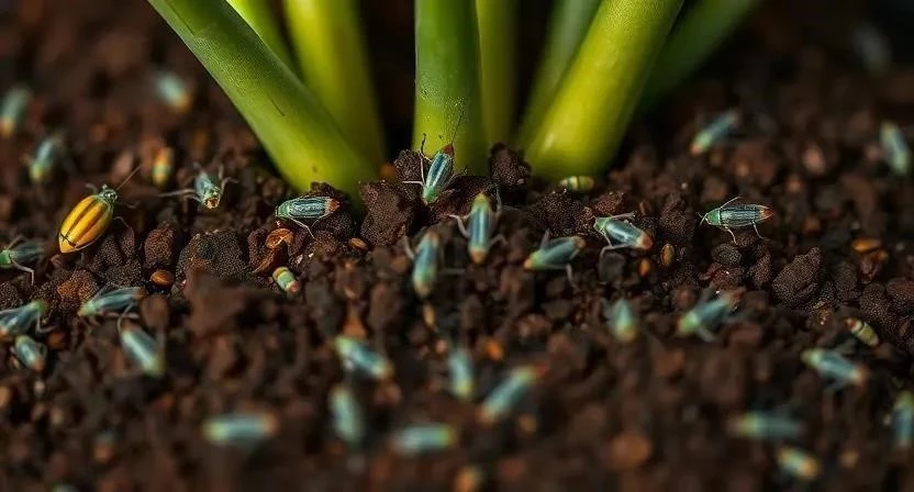 Сциариды – маленькие черные мушки, которые размножаются в переувлажненной почве. Их личинки питаются органическими веществами в почве, повреждая корни растений. Признаки поражения: появление мушек над почвой, увядание растений. Меры борьбы: нормализация полива, обработка почвы фунгицидами.