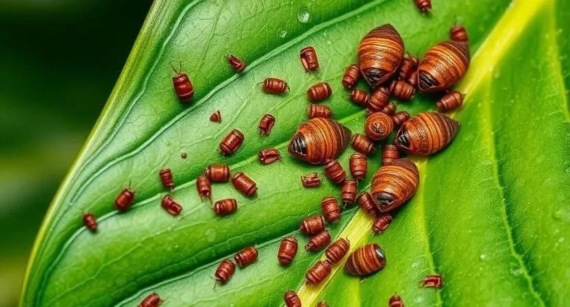 Щитовка – один из самых распространенных и коварных вредителей комнатных растений. Это небольшое насекомое, покрытое щитком, плотно прикрепляется к стеблям и листьям, высасывая соки. Признаки поражения: появление бурых выпуклостей на листьях и стеблях, липкий налет, замедление роста. Меры борьбы: обработка инсектицидами, удаление щитовки вручную, опрыскивание мыльным раствором.