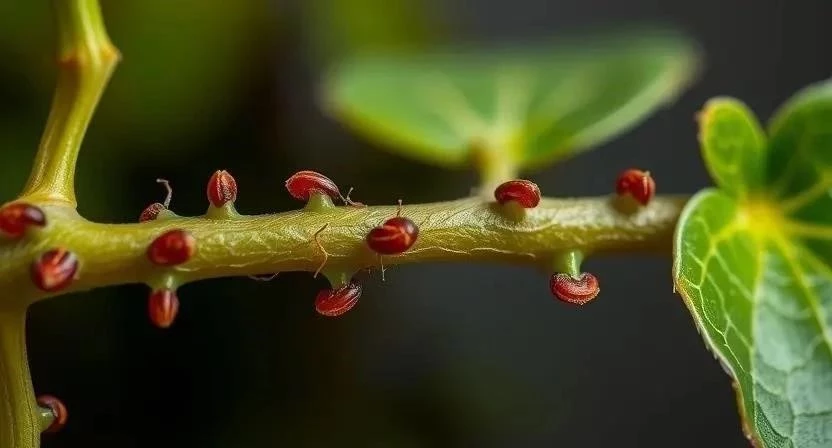- Щитовка: Внешне напоминает маленькие коричневые щитки, плотно прикрепленные к стеблям и листьям. Щитовка также высасывает сок из растения, ослабляя его.
