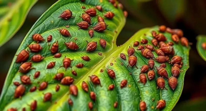 Щитовка (Diaspididae) – один из самых распространенных и коварных вредителей. Эти насекомые выглядят как маленькие коричневые щитки, плотно прикрепленные к листьям и стеблям. Признаки поражения: появление липкой пади, пожелтение и опадание листьев, замедление роста. Они опасны для всех видов комнатных растений, даже кактусов и орхидей.