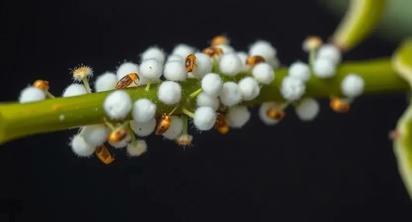 - Мучнистый червец: Оставляет на листьях и стеблях белые ватообразные комочки.