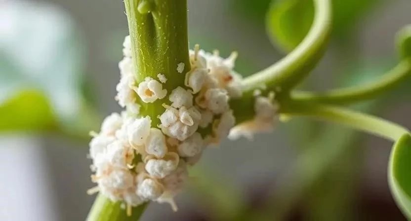 Мучнистый червец – насекомое, покрытое белым восковым налетом, напоминающим муку. Поражает листья, стебли и корни, высасывая сок. Легко распространяется по всему растению.