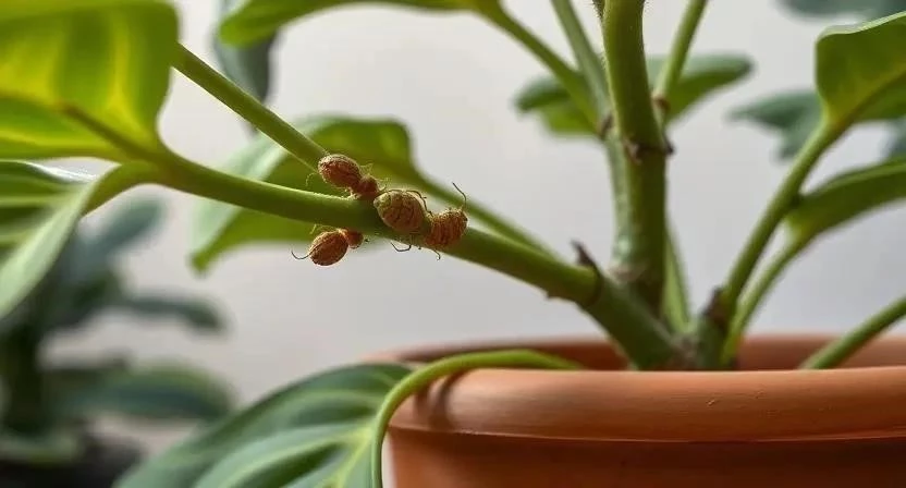 - Щитовка: Выглядит как маленькие коричневые щитки, плотно прикрепленные к стеблям и листьям.