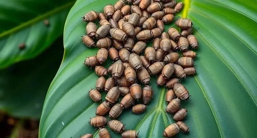 - Щитовка: Щитовка выглядит как маленькие коричневые бугорки, плотно прикрепленные к листьям и стеблям. Она высасывает сок из растения, ослабляя его.