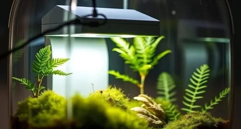Осенью, когда световой день становится короче, растения в террариуме нуждаются в дополнительном освещении. Идеальным вариантом являются фитолампы, которые обеспечивают растениям необходимый спектр света для фотосинтеза. Разместите фитолампу на расстоянии 20-30 см от растений и включайте ее на 10-12 часов в день. Я использую светодиодные фитолампы, так как они экономичны и не нагревают воздух. Это особенно важно для тропических растений, которые не любят перегрева.
