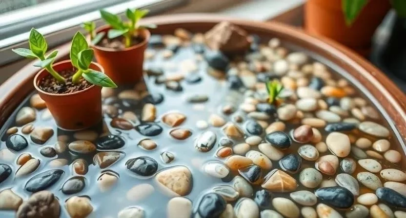 - Поддоны с водой и галькой: Поставьте горшки с растениями на поддоны, наполненные водой и галькой. Вода будет испаряться, повышая влажность вокруг растений.