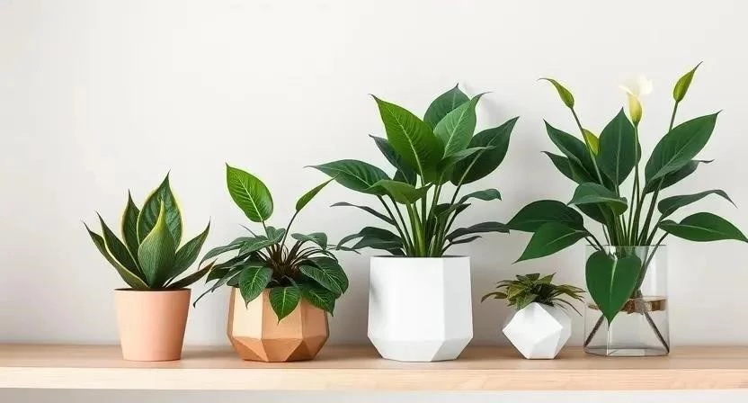 - Сансевиерия (тещин язык): Неприхотливое растение с мечевидными листьями, которое отлично очищает воздух и придает интерьеру графичность.