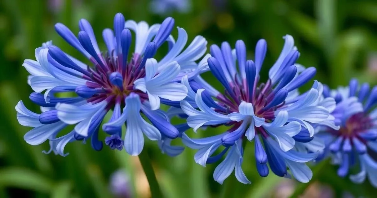 - Агапантус двуцветный (Agapanthus campanulatus) – имеет колокольчатые цветки, сочетающие в себе синие и белые оттенки.