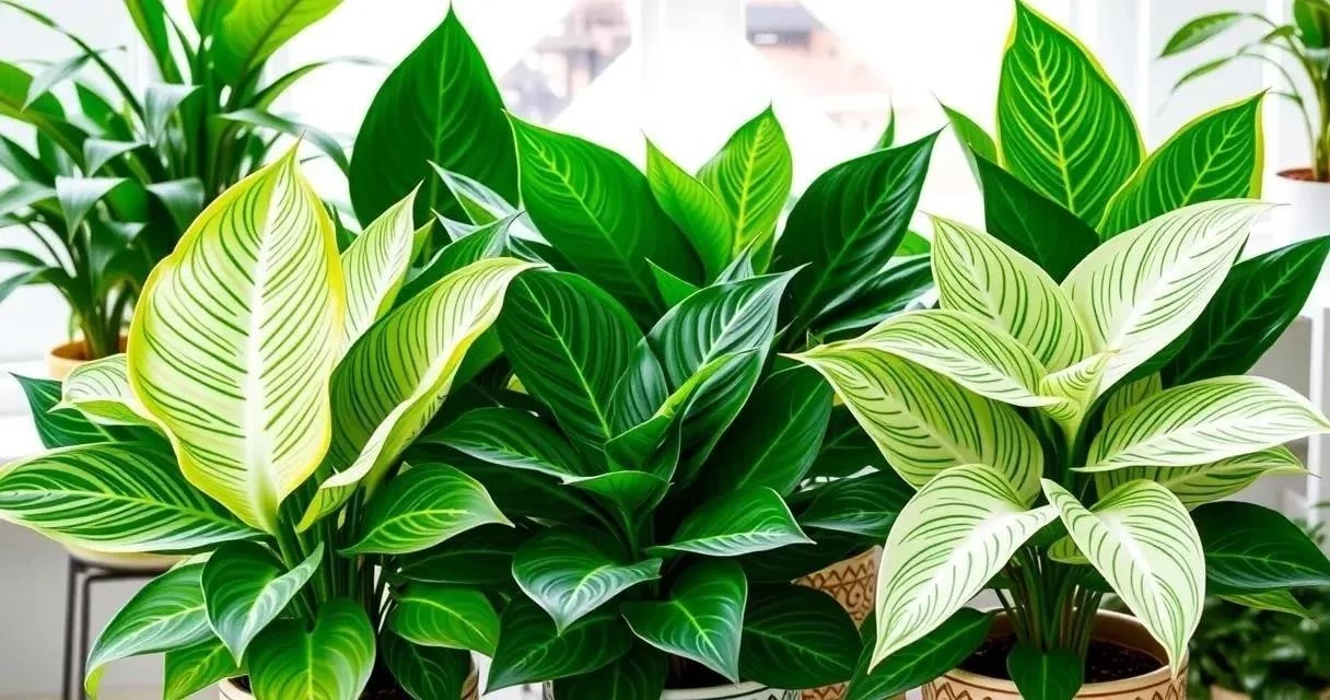 - Диффенбахия Seguine: Отличается крупными листьями с кремово-белыми пятнами.