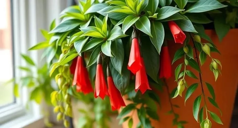 - Эсхинантус укореняющийся (Aeschynanthus radicans): Компактный вид с глянцевыми мелкими листьями и огненно-красными цветами.