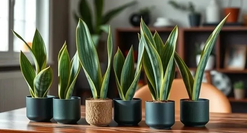 - Сансевиерия Компакта: Классический вид с темно-зелеными листьями и светлыми полосками.